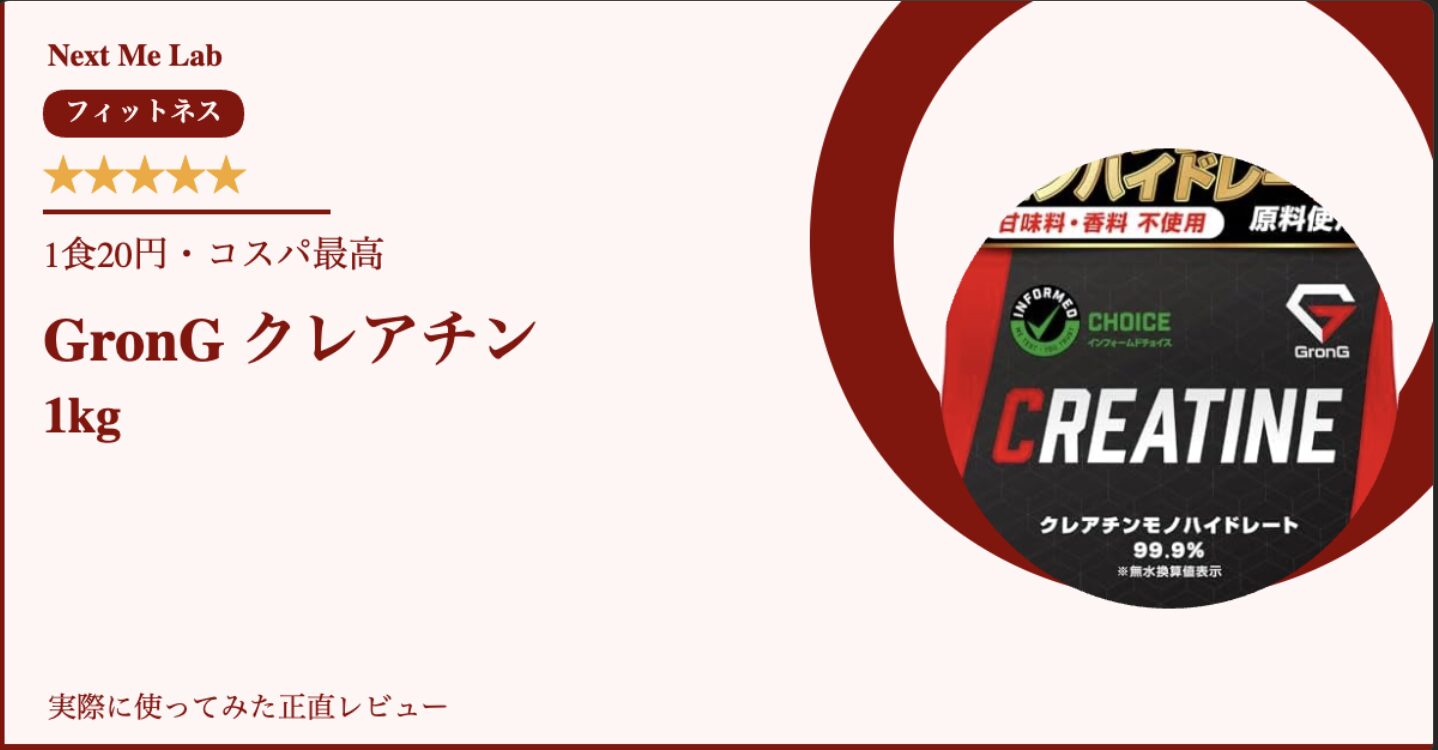 グロングのクレアチンは1食20円以下、国内製造、99.9%高純度。「とりあえず試してみる」最初の1本としてほぼ最適です。