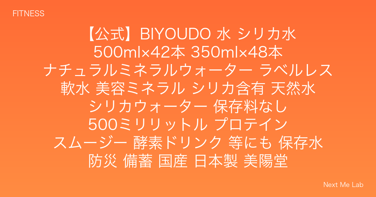BIYOUDO シリカ水は、国産の天然ミネラルウォーターで、美容に関心のある大人向けに設計された商品です。シリカという美容ミネラルを含んでおり、軟水なので毎日飲みやすいのが特徴。2,380円(税込)で42本セット(500ml)または48本セット(350ml)が選べます。ラベルレスなので、ゴミ処理が楽という声も多いですね。